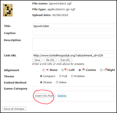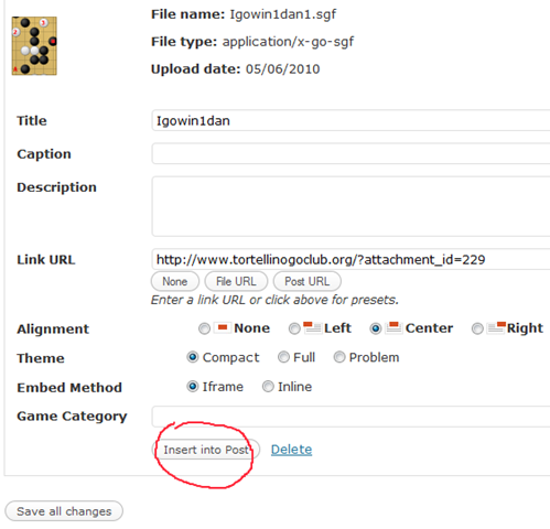 Infine attendete qualche istante. Quando il plugin di Eidogo per WordPress riconoscerà che state caricando un file SGF si aprirà la schermata seguente, dove potete impostare alcune opzioni per poi confermare con ‘insert into post’.